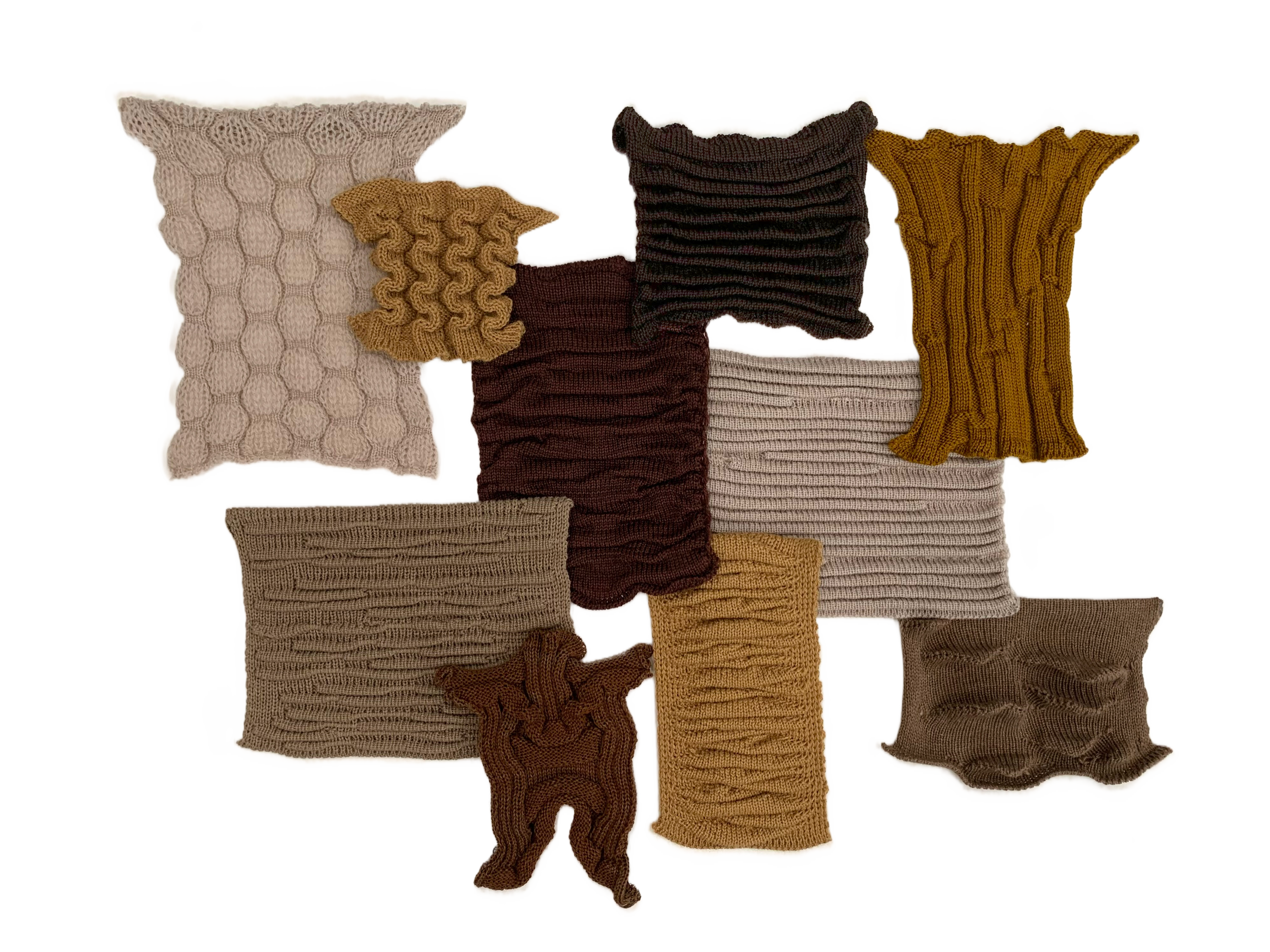 This project explores the fascinating world of mushrooms and their complex, three-dimensional structures. By closely studying the organic shapes, patterns and surfaces of various mushrooms, I developed a series of knitting samples on the Passap Duomatic 80 that show the structures of mushrooms through three-dimensional patterns in the knitted fabric.